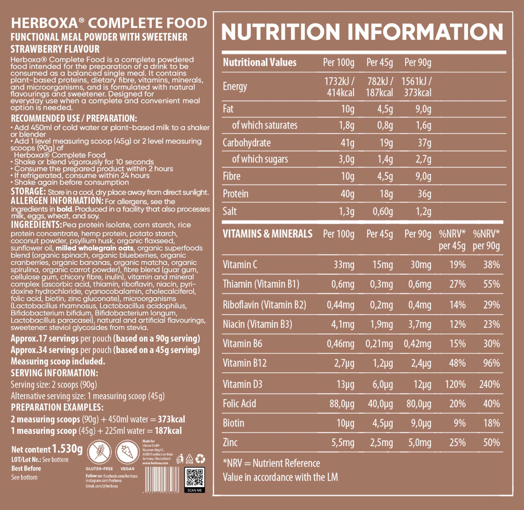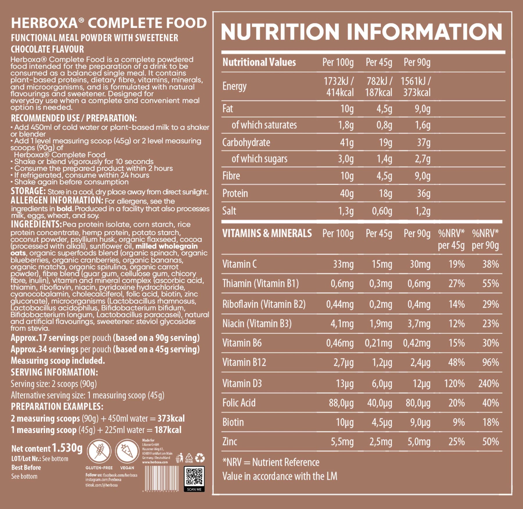 Hver portion på 90 g Herboxa Complete Food indeholder 36 g plantebaseret protein af høj kvalitet, der stammer fra ærter og ris, hvilket sikrer en mættende og velafbalanceret proteinprofil.